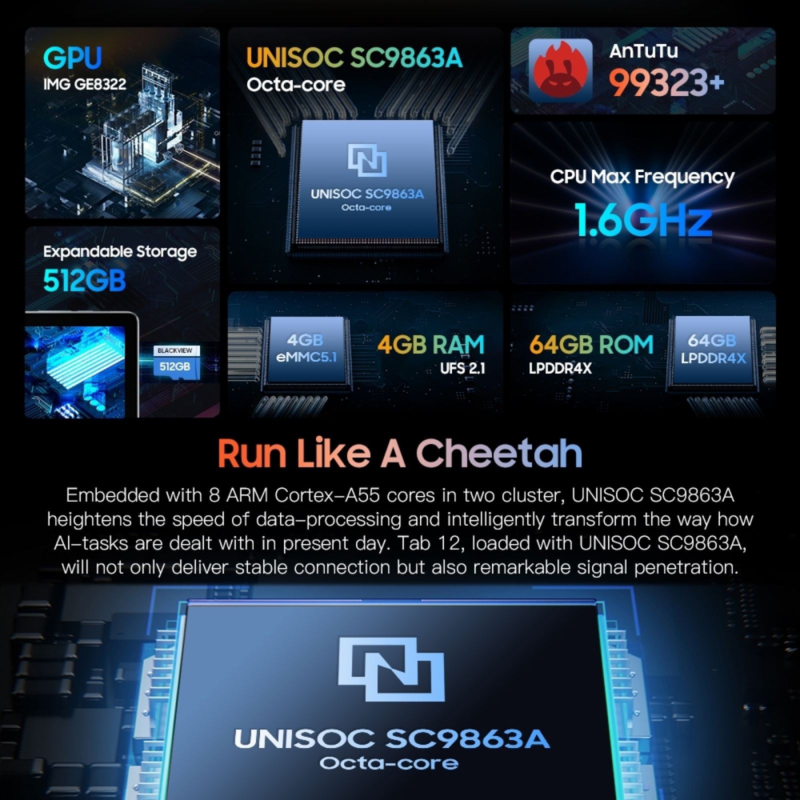 1. Spreadtrum SC9863A Octa Core CPU, 4GB+64GB running memory, use more smoothly.